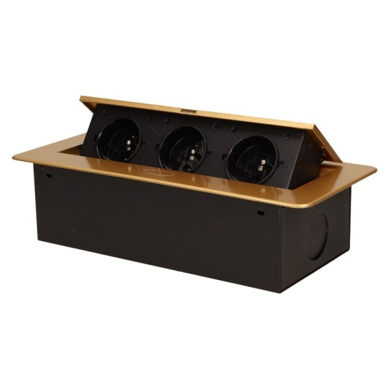 Zestaw trzech gniazd sieciowych z uziemieniem i przesłonami torów prądowych w obudowie chowanej w blat. Urządzenie przeznaczone jest do montażu w biurkach, blatach i stołach, może być zamontowane zarówno w pozycji pionowej jak i poziomej, zapewniając dostęp do gniazd elektrycznych. Zalecany przewód OWY 3 × 1,5 mm2 (brak w zestawie). Dostępne kolory: czarny, srebrny, złoty, mosiądz, grafit.