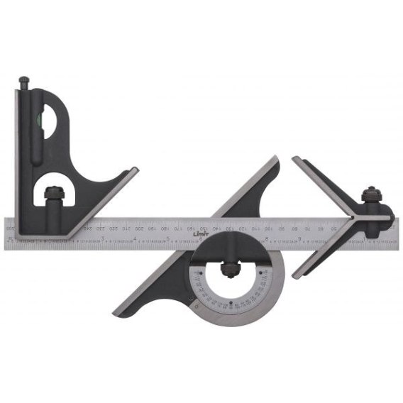 Wykonany ze stali węglowej, z elementami regulacyjnymi ze stali nierdzewnej. Z kątomierzem tarczowym, przykładnią kątową i głowicą środkującą. Wszystkie części są przesuwane na liniale z podziałką. Ampułka poziomowania na tarczy kątomierza i przykładni kątowej. Podziałka na liniale w mm i calach.