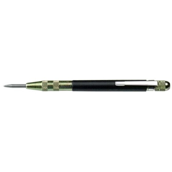 Do trasowania z punktowaniem. Naciśnięcie przyrządu w dół uwalnia sprężynę udarową końcówki, która wybija punkt. Końcówka ze stali chromowo-wanadowej. Chwyt korpusu z gumy.