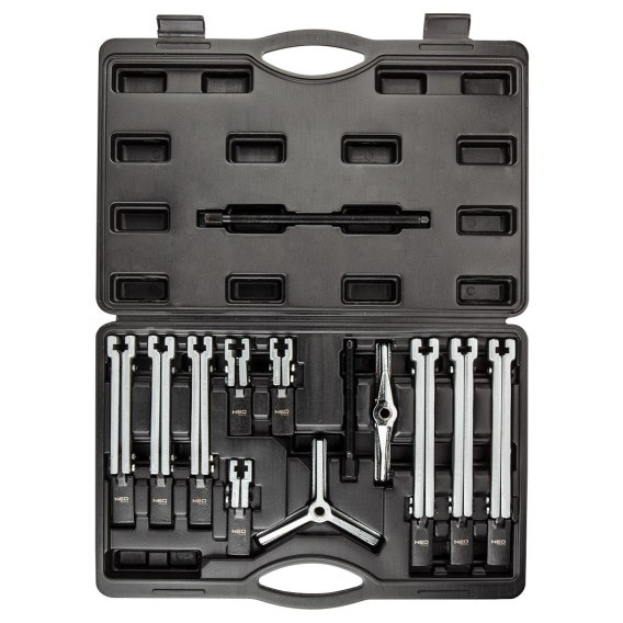 Ściągacze do łożysk: 100, 200, 250 mm NEO to 22-częściowy zestaw do ściągania łożysk, kół pasowych i kół zębatych. Elementy zestawu pozwalają na montaż ściągaczy 2- i 3-ramiennych, zarówno wewnętrznych, jak i zewnętrznych. Zestaw jest w stanie zastąpić 12 różnych ściągaczy. Zestaw zapakowany w walizkę.