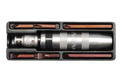 Wkrętak udarowy służy do wykręcania i luzowania zapieczonych bądź mocno dokręconych śrub, wkrętów i nakrętek. Do pracy wykorzystuje zamianę energii kinetycznej uderzenia młotka na ruch obrotowy końcówki śrubokrętowej. Pracę umożliwia precyzyjna przekładnia ślimakowa zbudowana z gwintu o bardzo długim skoku. Wkrętak posiada metalową rączkę, która podnosi wytrzymałość produktu podczas uderzania młotkiem. W zestawie znajduje się 6 bitów ze stali chromowo wanadowej CrV1650 oraz końcówka - przejście z kwadratu 1/2" na sześciokąt 5/16". Narzędzie bardzo często wykorzystywane w zakładach remontowych, serwisach mechanicznych i samochodowych.