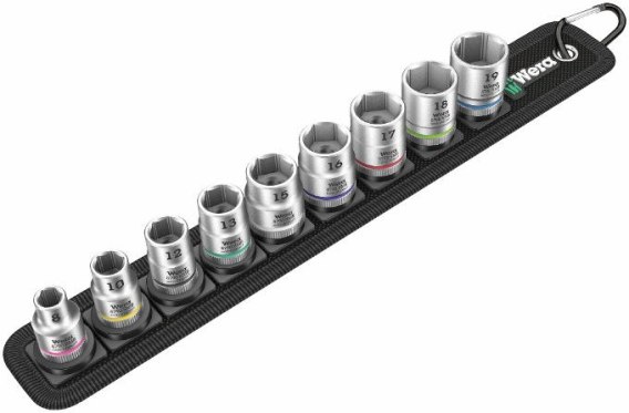 wykonana w stylu charakterystycznym dla firmy Wera z 9 kluczami nasadowymi i narzędziem do usuwania nakrętek do pracy w ograniczonych przestrzeniach.
