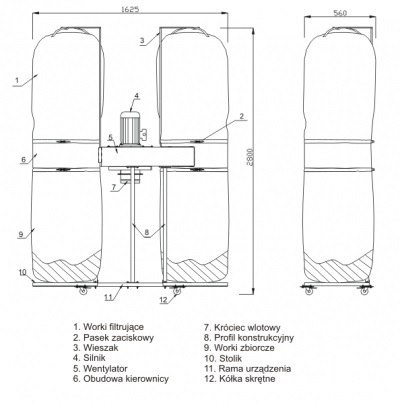 Worki zbiorcze umieszczone na podstawie,mocowane do obudowy za pomocą pasków zaciskowych.